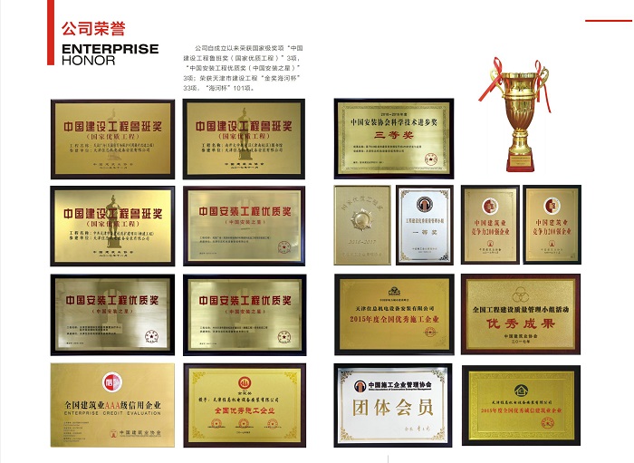 公司多次荣获“鲁班奖”及安装业最高奖项“安装之星”等国家级奖项,同时屡次荣获天津市建设工程“金奖海河杯”“海河杯”等天津市级奖项,并连续两年被中国建筑业协会评为中国建筑业竞争力200强企业。